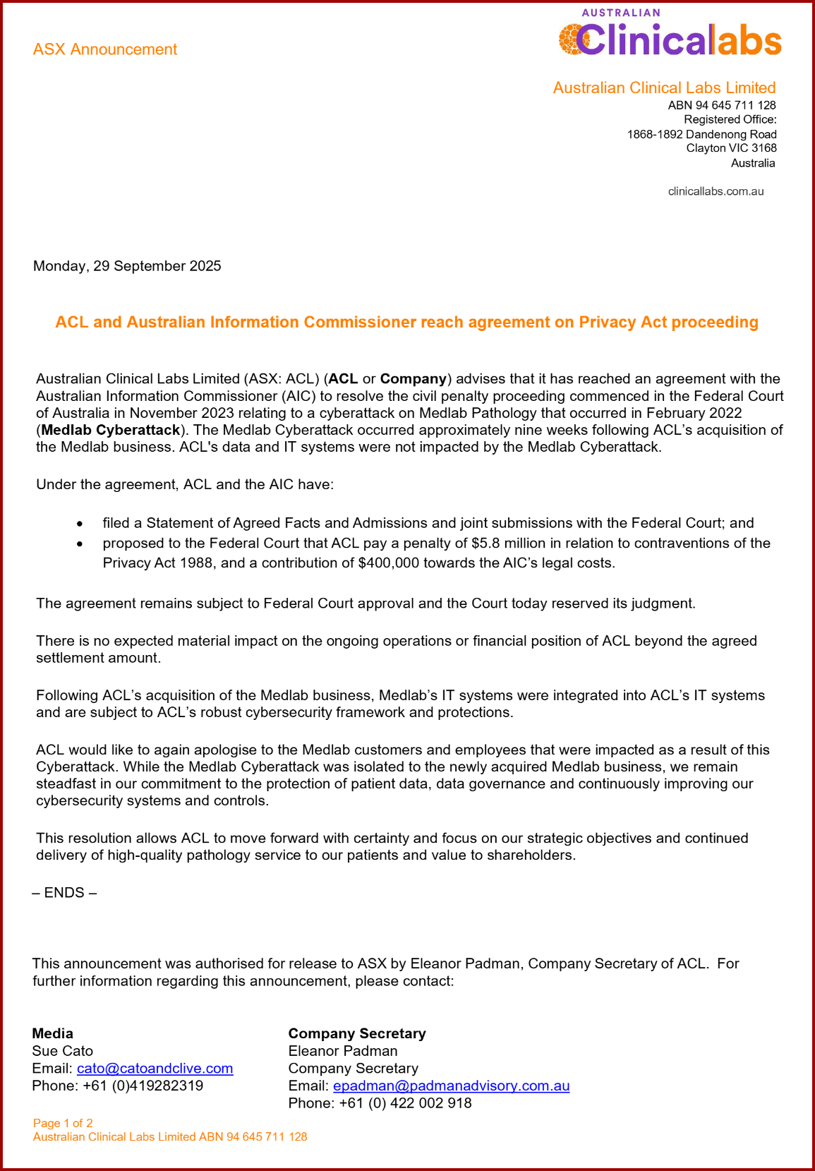 “ACL would like to again apologise to the Medlab customers and employees that were impacted as a result of this cyber attack. While the Medlab cyber attack was isolated to the newly acquired Medlab business, we remain steadfast in our commitment to the protection of patient data, data governance and continuously improving our cyber security systems and controls,” - ACL said in a 29 September statement. An image of the full statement is included further down this page.