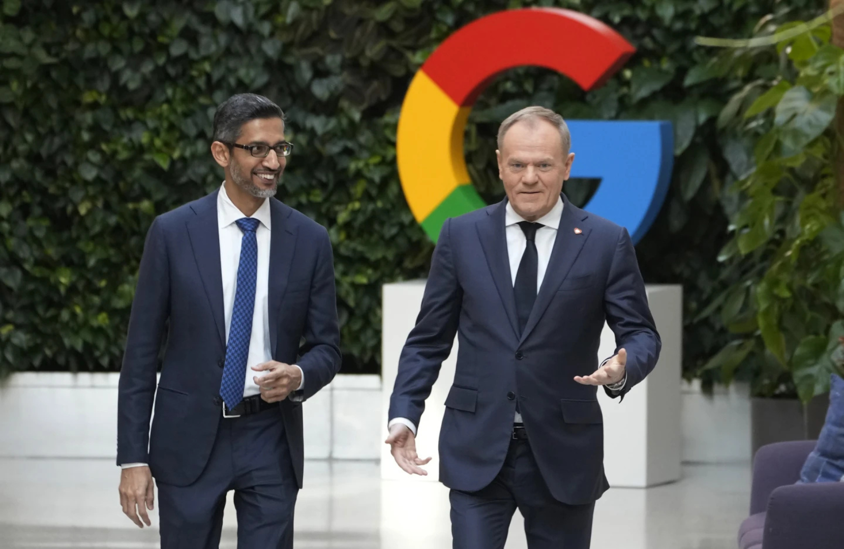 Google and Alphabet CEO Sundar Pichai and Poland Prime Minister Donald Tusk. AP.