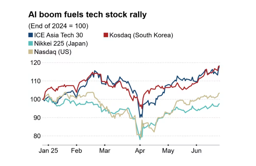 The chart compares tech stock performance across key indices—ICE Asia Tech 30, Kosdaq (South Korea), Nikkei 225 (Japan), and Nasdaq (US)—from January to June 2025. It shows how Asia’s tech markets have outpaced the Nasdaq, driven by AI-fueled growth and NVIDIA’s influence. Source: Quick.