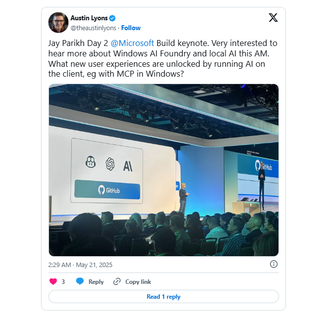 A brief highlight from the keynote showed Parikh outlining how tools like Windows AI Foundry and MCP are helping bring AI closer to local development environments.