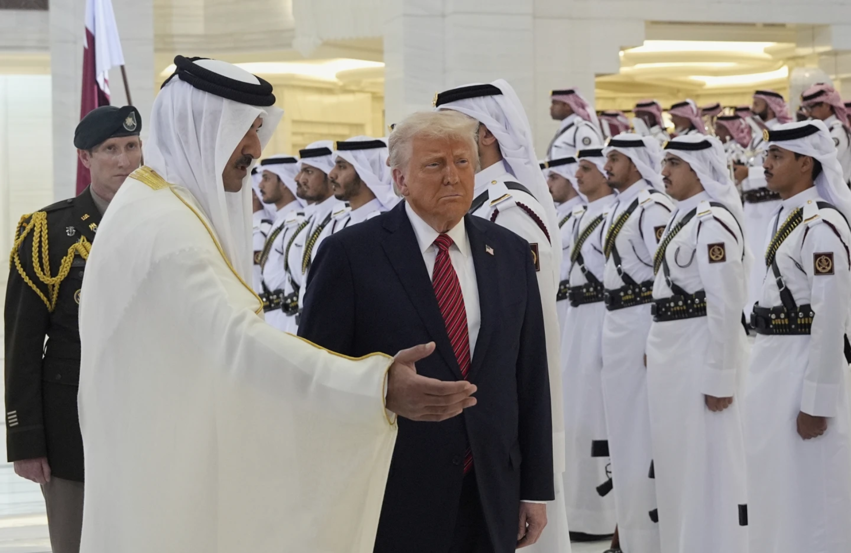 Qatar’s Emir Sheikh Tamim bin Hamad Al Thani welcomes President Donald Trump during an official welcoming ceremony at the Amiri Diwan in Doha, Qatar, Wednesday, May 14, 2025. (AP Photo/Alex Brandon)