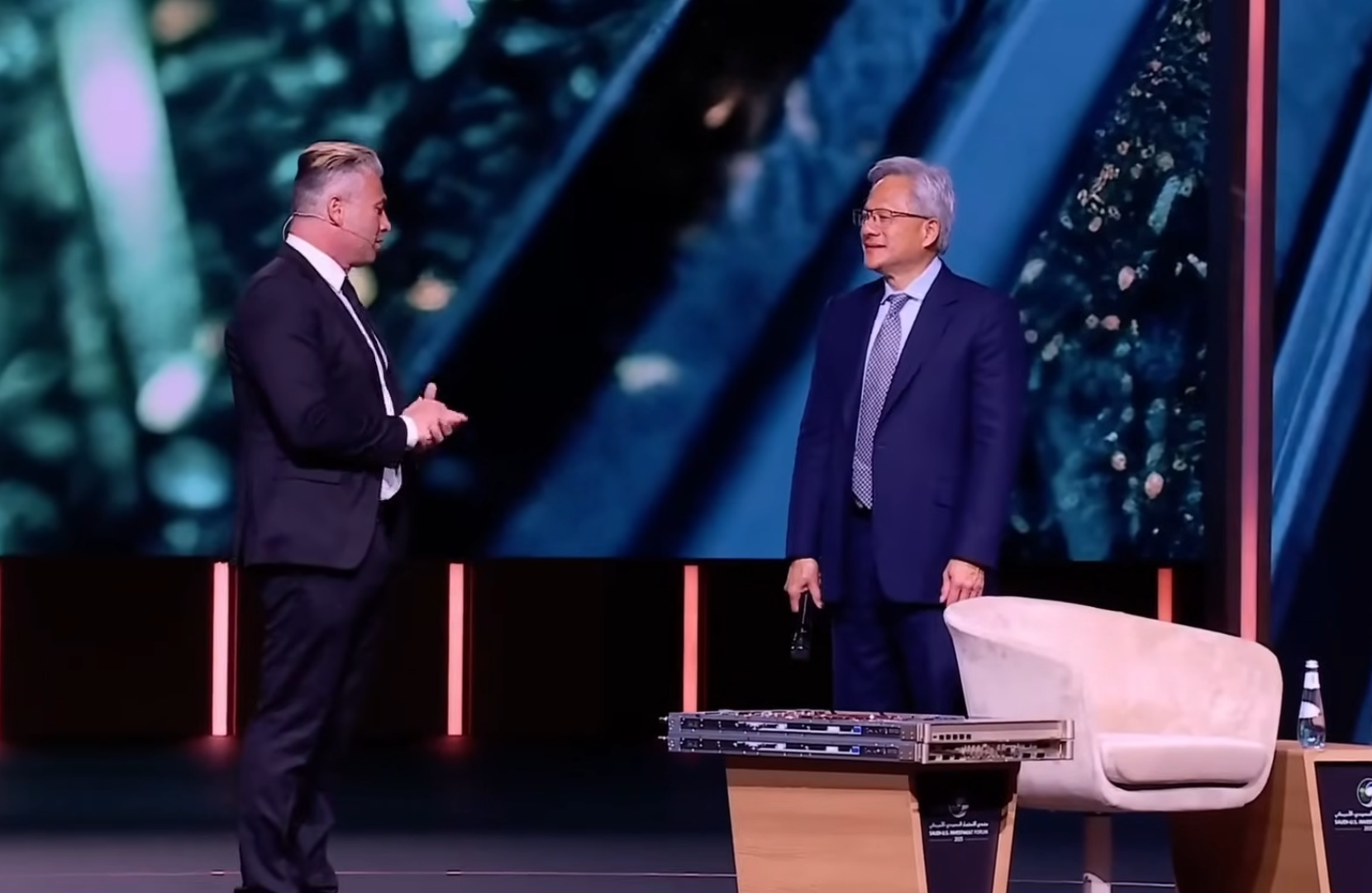 Tareq Amin CEO of HUMAIN and Jensen Huang CEO of NIVIDIA presenting at the U.S.–Saudi AI investment forum.